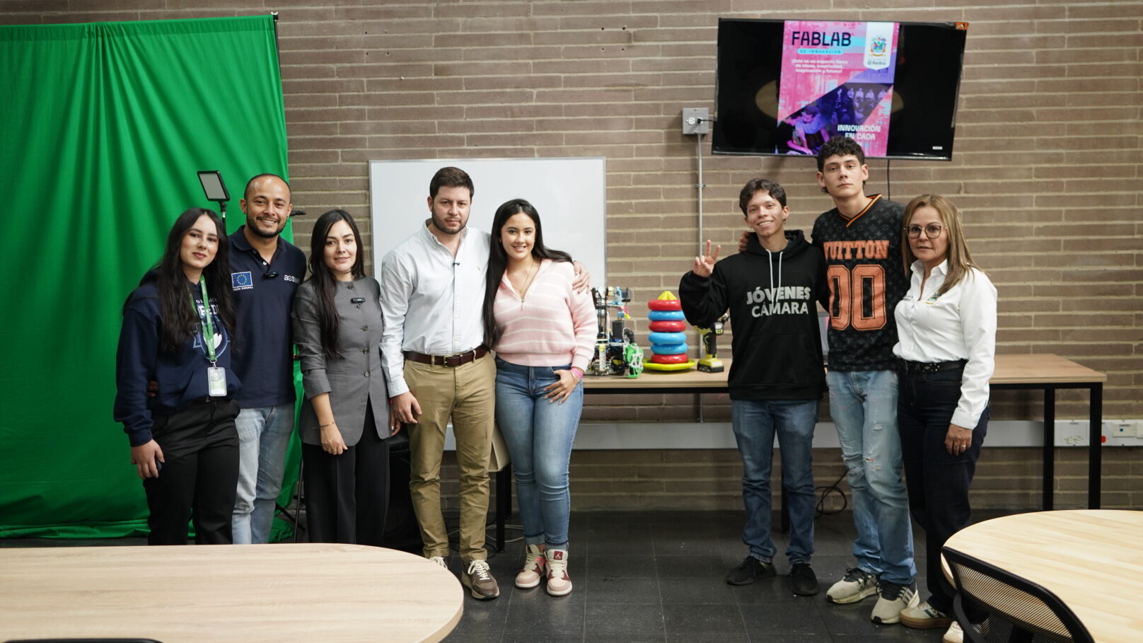 La dotación incluyó mesas para estaciones de trabajo, una estación de grabación tipo podcast con micrófonos, bases, luces y chroma, 15 computadores, una cámara profesional, sillas ergonómicas, equipos de edición, un Smart TV y licencias de software gráfico y de video.