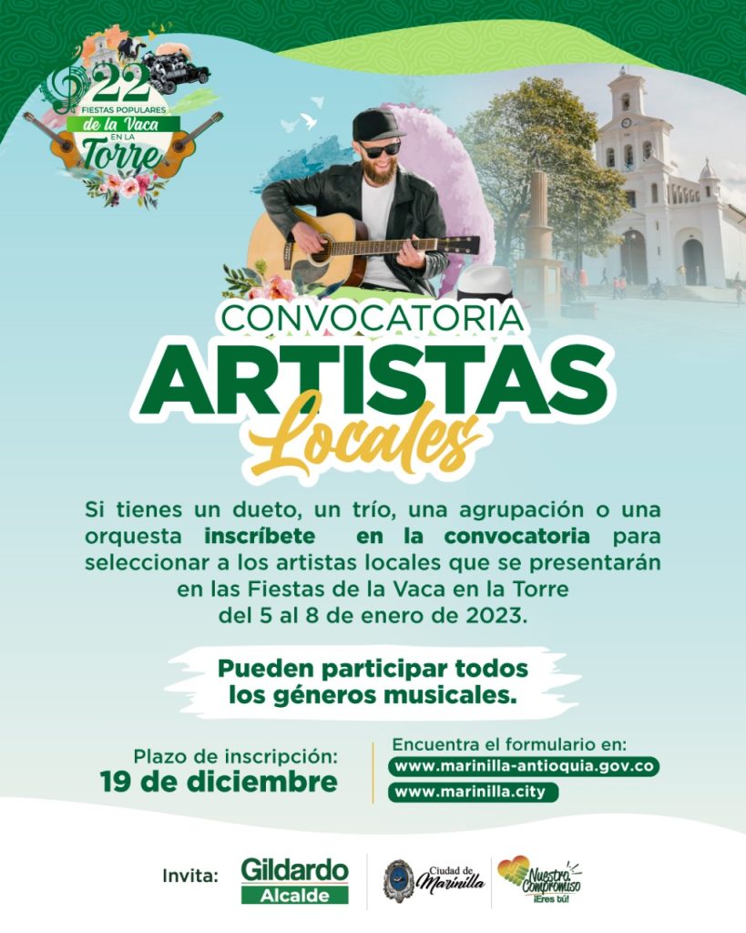 Una nueva convocatoria con la que se seleccionarán a los artistas locales que participarán de las Fiestas de la Vaca en la Torre 2023, fue lanzada por la Administración Municipal de Marinilla y estará vigente solo hasta el 19 de diciembre.