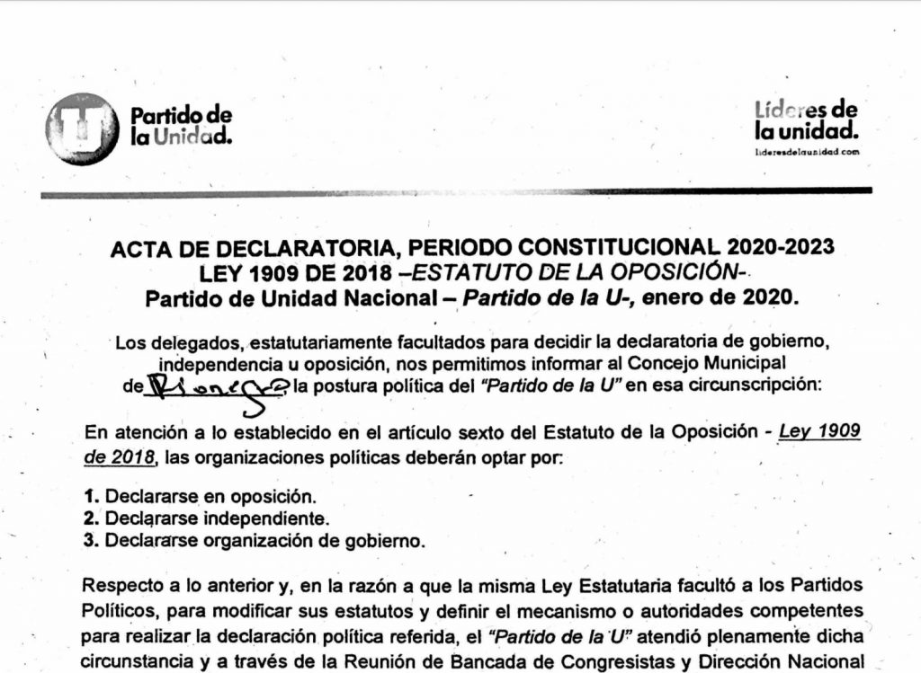 Este medio conoció la declaración oficial del partido de Unidad Nacional o de la U, en la cual se lee textualmente que “la postura del partido de la U en esta circunscripción será independiente al alcalde municipal.”