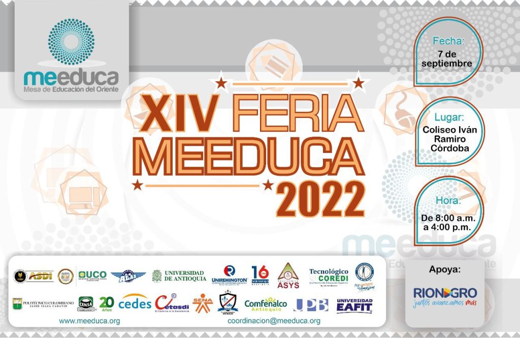 Este próximo 7 de septiembre se realizará la XIV Feria MEEDUCA 2022, un evento que reúne a las principales instituciones de educación superior de Antioquia, con el fin de presentar las ofertas institucionales a estudiantes de 11 de establecimientos educativos de la región del Oriente antioqueño.