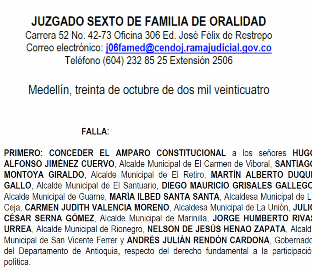 La decisión del juzgado le da la razón a los alcaldes del Altiplano del oriente de Antioquia y al Gobernador del departamento los cuales interpusieron la acción de tutela para garantizar la realización de la consulta popular que se había notificado como suspendida. Según expusieron en su demanda, el proceso electoral, convocado para el 9 de noviembre de 2025, buscaba que los ciudadanos de ocho municipios decidieran sobre la conformación del Área Metropolitana del Valle de San Nicolás.