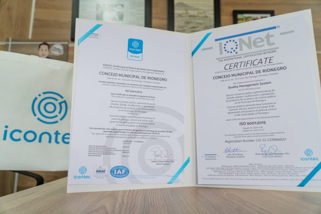 “Para Icontec es un honor ser aliado del Concejo Municipal de Rionegro en la mejora continua a través de la auditoría y certificación de su sistema de gestión bajo la norma ISO 9001, y desde nuestro Consejo Directivo y Comité de Certificación, Icontec expresa su agradecimiento por haber confiado en la trayectoria y experiencia como ente de certificación en Colombia y como organismo de normalización” dijo el delegado de Icontec David Molina, posteriormente hizo entrega de la certificación de gestión de calidad al Concejo Municipal de Rionegro.