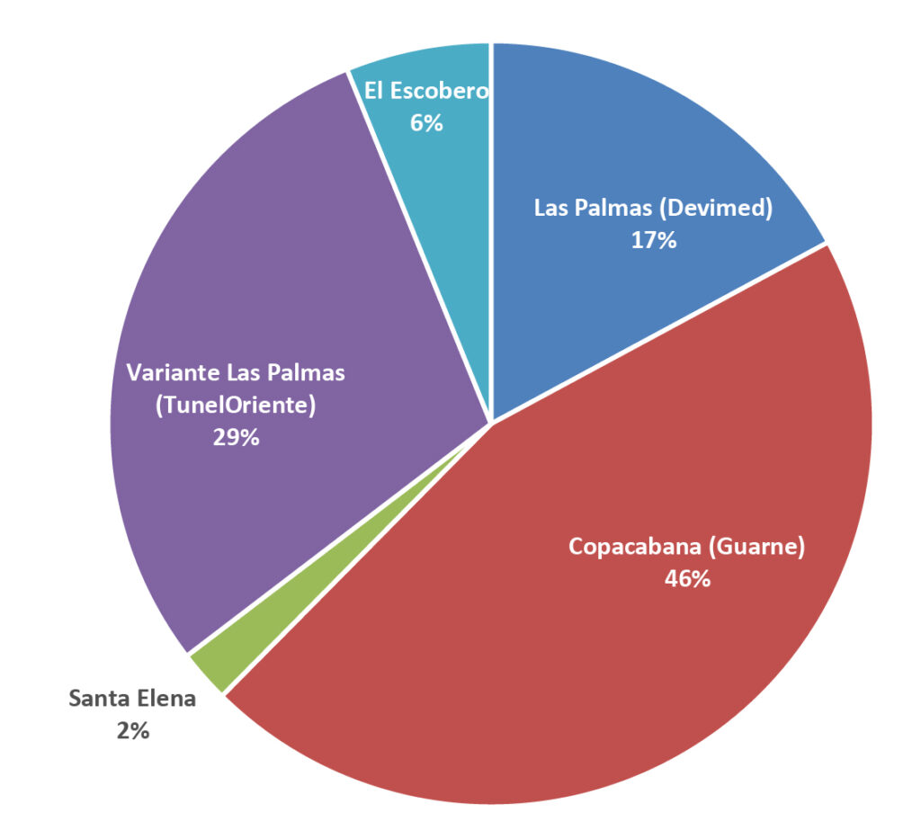 La distribución de pasajeros por día entre el Valle de Aburrá y el valle de San Nicolás2, para el año 2015, oscilaba entre 170,099 y 227,964, y para el año 2016, entre 193,083 y 260,351, para un promedio total de 227.077 pasajeros. Este flujo estaba distribuido así: el 6% Escobero, 17% Palmas, 46% Copacabana, 2% Santa Elena y el 29% para la proyección con el Túnel de Oriente, observándose un aumento aproximado del 12% en estos dos años.