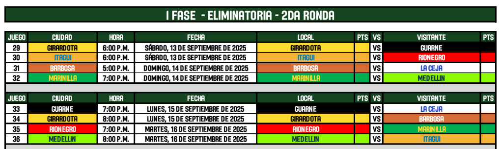 Este sábado se iniciará la segunda ronda con dos encuentros programados. Girardota enfrentará a Guarne a las 6:00 p.m. en el Coliseo Metropolitano Inder Girardota. Simultáneamente, Itagüí de local se medirá contra Rionegro a la misma hora en el Coliseo Luis Fernando Paniagua Rincón.