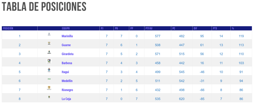 Marinilla confirmó su rendimiento ofensivo al vencer a La Ceja con un marcador de 107 a 80. Por su parte, Guarne derrotó a Medellín con un resultado de 85-67 en el partido correspondiente a su jornada.