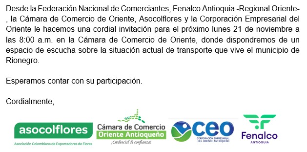 María José Bernal, Directora de Fenalco, manifestó que “nosotros rechazamos categóricamente este paro; invitamos a los actores que tengan inconformidades a vincularse a espacios de conversación con los actores que sean competentes y que se dé el normal curso de la temporada navideña, que es tan importante para el comercio. En caso de darse un paro, no solo paga el comercio, paga todo Rionegro, los trabajadores, las personas que se movilizan diariamente y demás. Invitamos al diálogo y rechazamos categóricamente desde el comercio, el paro que está anunciado para el próximo 25 de noviembre”.