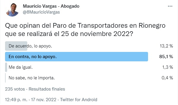 También se dio a conocer un sondeo a través de la red social twitter en donde se preguntó a los usuarios su opinión frente a la convocatoria a paro del transporte público. El 85.1% manifestó estar en desacuerdo y solo el 13.2% estaría de acuerdo. Esta sería solo una de las voces que llaman a que el cese de actividades no se haga en época de fin de año por lo que sería las afectaciones no solo al sector comercio sino a los ciudadanos que buscan desplazarse desde y hacia sus destinos dentro de la localidad en sus jornadas laborales, cumplimiento de citas médicas, fiestas y actividades decembrinas.