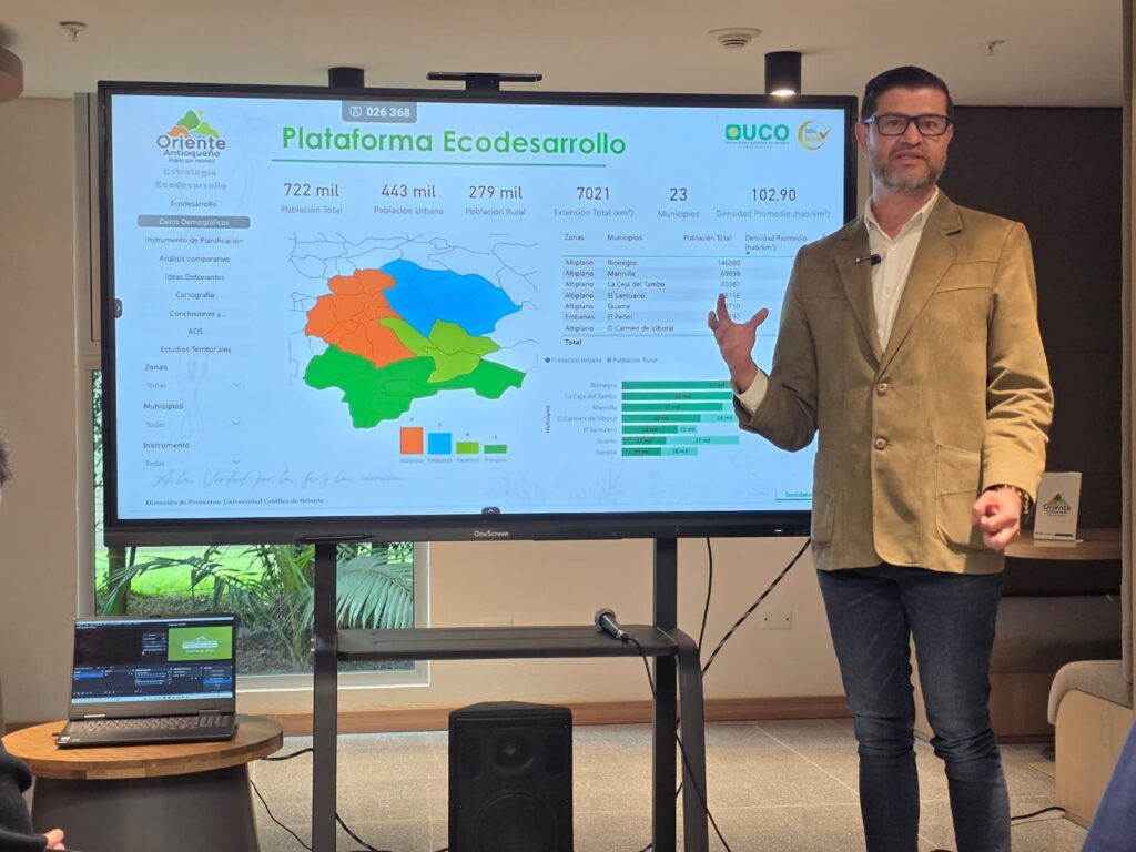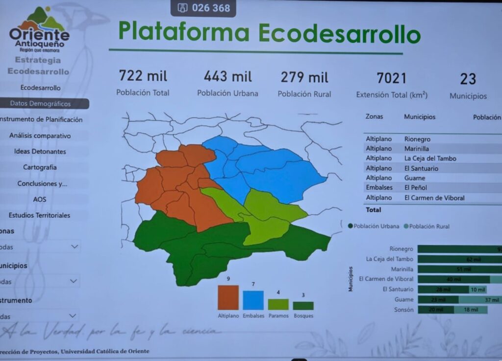 En evento de socialización, se presentó a medios de comunicación de la subregión la plataforma digital de Ecodesarrollo, descrita como una herramienta para democratizar la información. Albeiro Monsalve Marín, vicerrector de Extensión de la Universidad Católica de Oriente y en nombre del Centro de Estudios Territoriales, explicó que esta plataforma recoge datos demográficos, instrumentos de planificación y un análisis comparativo entre los planes de desarrollo y los esquemas, planes básicos y planes de ordenamiento de cada municipio. Según dijo, el sistema permite consultar, municipio por municipio, información como el número de habitantes en zona rural y urbana, y la cartografía oficial con zonas de reserva y catastro.