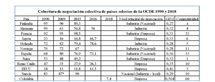 La evidencia empírica muestra que los países, donde se tienen mayores tasas de sindicalización y cobertura de la negociación colectiva, y por supuesto, donde se pagan mejores salarios y existen mayores derechos son más competitivos y equitativos. En el cuadro que sigue, con información tomada de la OIT, aparece Finlandia con tasas muy altas de cobertura de la negociación colectiva, un GINI de 0,27 (indicador de una baja desigualdad) y niveles muy altos de competitividad. En el otro extremo aparece Colombia, con baja cobertura de la negociación colectiva, un GINI de 0,504 (indicador de una alta desigualdad) y bajo nivel de competitividad. El papel puede con todo, pero los hechos son contundentes: Los sindicatos, la negociación colectiva, y las mejoras salariales no quitan competitividad a los países, sino todo lo contrario, mejoran la competitividad del país.