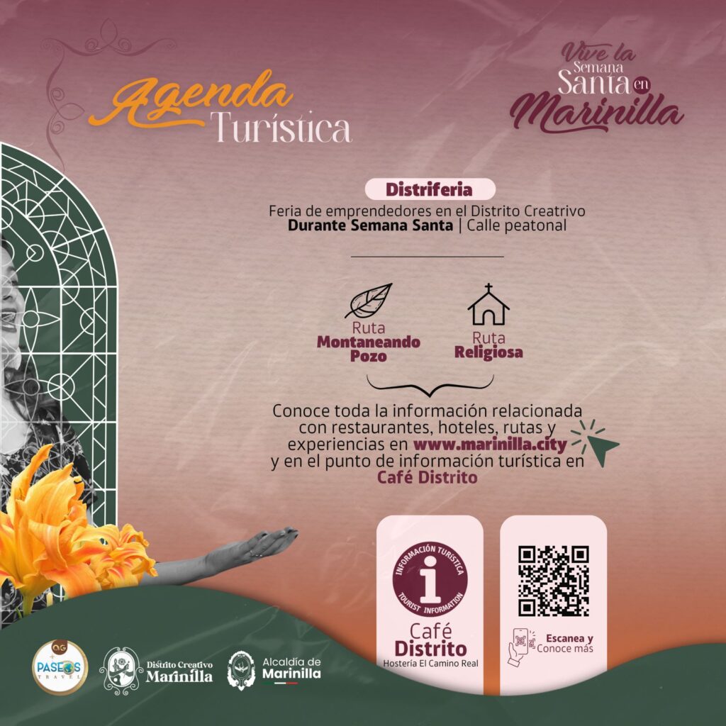 Adicionalmente, el municipio se ha preparado en alianza con sus empresarios para ofrecer una agenda de experiencias turísticas durante toda la semana, tales como Montaneando Pozo y la Ruta Religiosa. Los detalles sobre estas emocionantes experiencias están disponibles en MarinillaCity, donde las personas podrán acceder a la información del operador turístico. Además, en Café Distrito, ubicado en la Hostería El Camino Real, se tendrá un punto de información completo, donde se podrán obtener datos y contactos útiles sobre hoteles, restaurantes y otros.