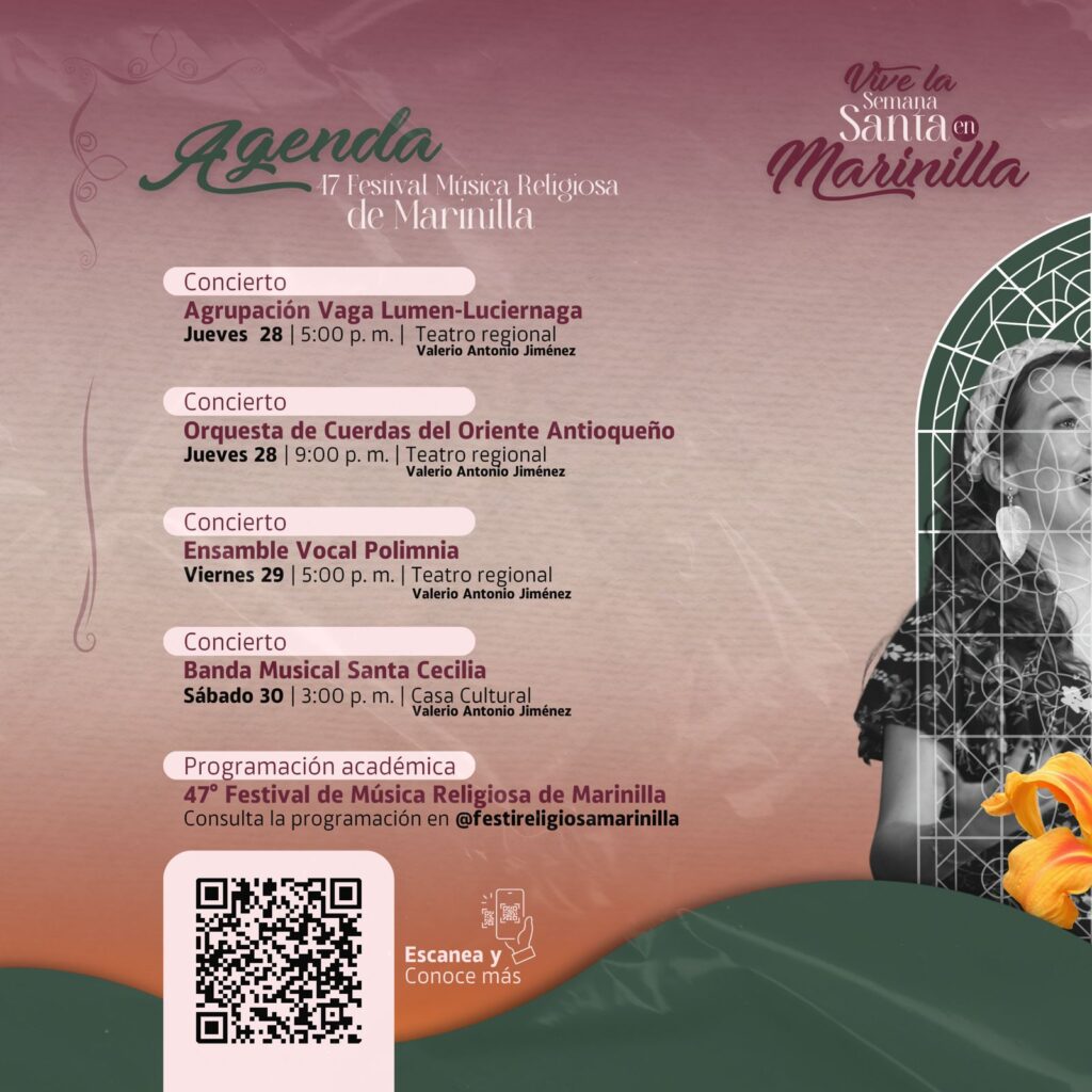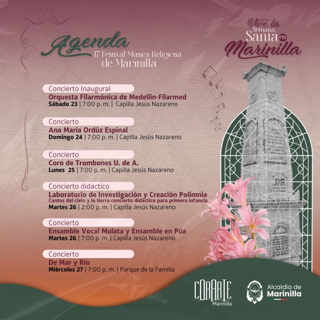 Uno de los eventos destacados es la versión número 47 del Festival de Música Religiosa de Marinilla, apoyado por la Alcaldía y organizado por la Corporación Amigos del Arte «Corarte». Este festival contará con la participación de renombradas orquestas como la Filarmónica de Medellín Filar-Med y la Orquesta de Cuerdas del Oriente Antioqueño, así como el Ensamble Vocal Polimnia y la destacada artista Ana María Orduz, entre otros.