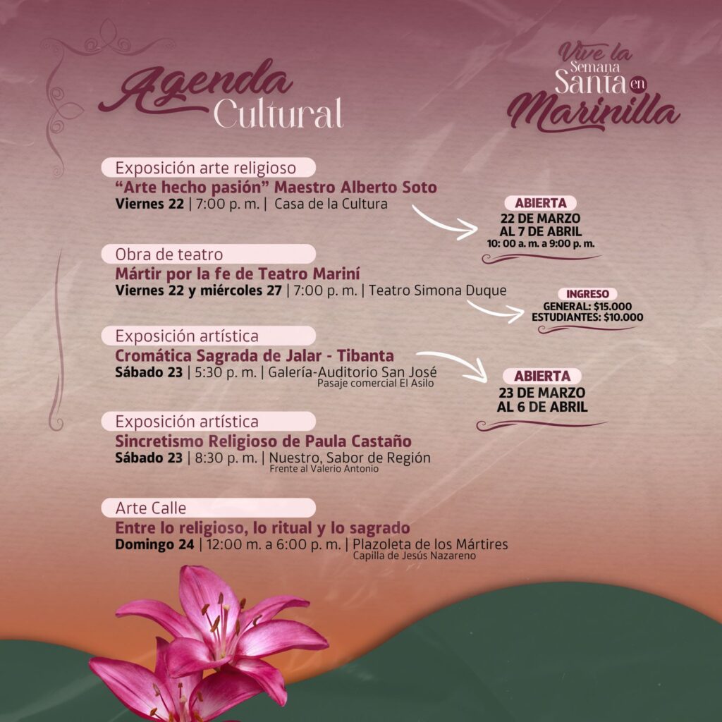 El Secretario de Cultura y Patrimonio, Julián Montes dijo que “Como es tradición en Marinilla, nos preparamos para recibir a los turistas y marinillos que disfrutan de las procesiones y actos religiosos en las diferentes parroquias y que viven también las actividades culturales que Marinilla tiene como patrimonio cultural inmaterial, como las esculturas y exposiciones de arte religioso y el Festival de Música Religiosa”.