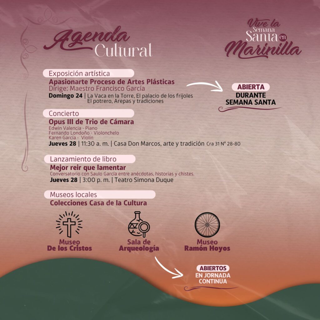 Dentro de la agenda cultural del municipio, destacan varias exposiciones, incluyendo la del maestro Alberto Soto titulada «Arte hecho pasión», así como exposiciones de arte, pintura y arte callejero. La Casa de la Cultura también ofrecerá colecciones como el Museo de los Cristos, el Arqueológico y el Museo Ramón Hoyos. Asimismo, se llevará a cabo el lanzamiento del libro «Mejor reír que lamentar» del conocido artista y trovador marinillo, Saulo García «Gelatina».
