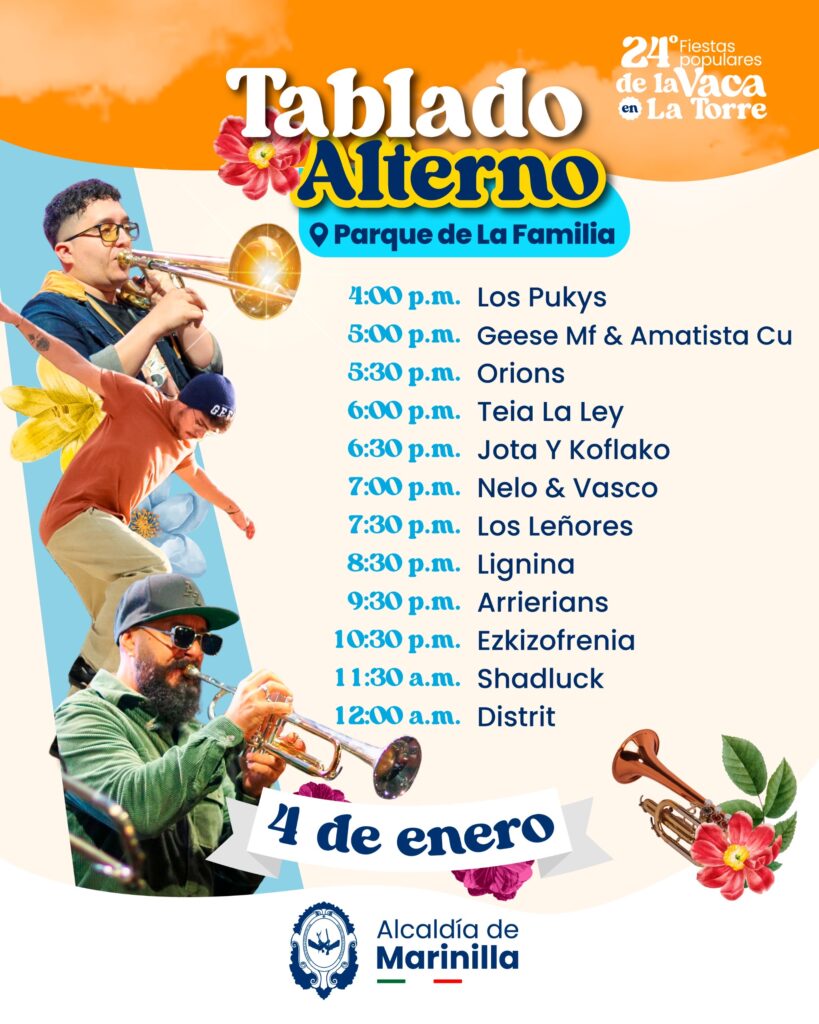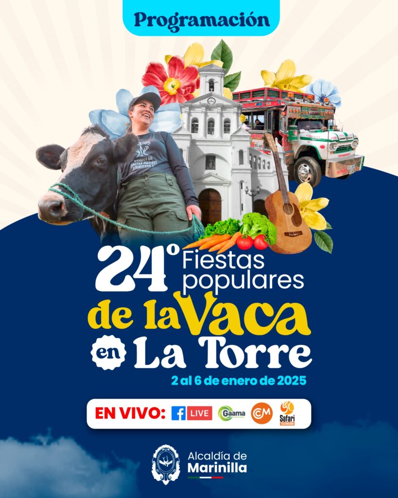 Las Fiestas Populares de la Vaca en la Torre se celebrarán del 2 al 6 de enero de 2025 en Marinilla, con una variada programación que incluye música, deportes y actividades culturales. A continuación, se detallan los eventos programados para cada día: