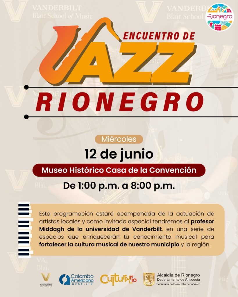 Desde la Administración Municipal de Rionegro y la Secretaría de Desarrollo Económico junto a la Subsecretaría de Cultura, Patrimonio e Industrias Creativas, invita a la comunidad al Festival Internacional de Jazz 2024 Jazz Camp in Rionegro en su primera versión, evento que tendrá lugar el miércoles 12 de junio a partir de la 1:00 p.m. y hasta las 8:00 p.m. en el Museo Histórico Casa de la Convención; programación que estará acompañada de la presentación de artistas locales y del Ensamble de Jazz de la Universidad de Vanderbilt de Estados Unidos, bajo la dirección del profesor Middagh como invitado especial.