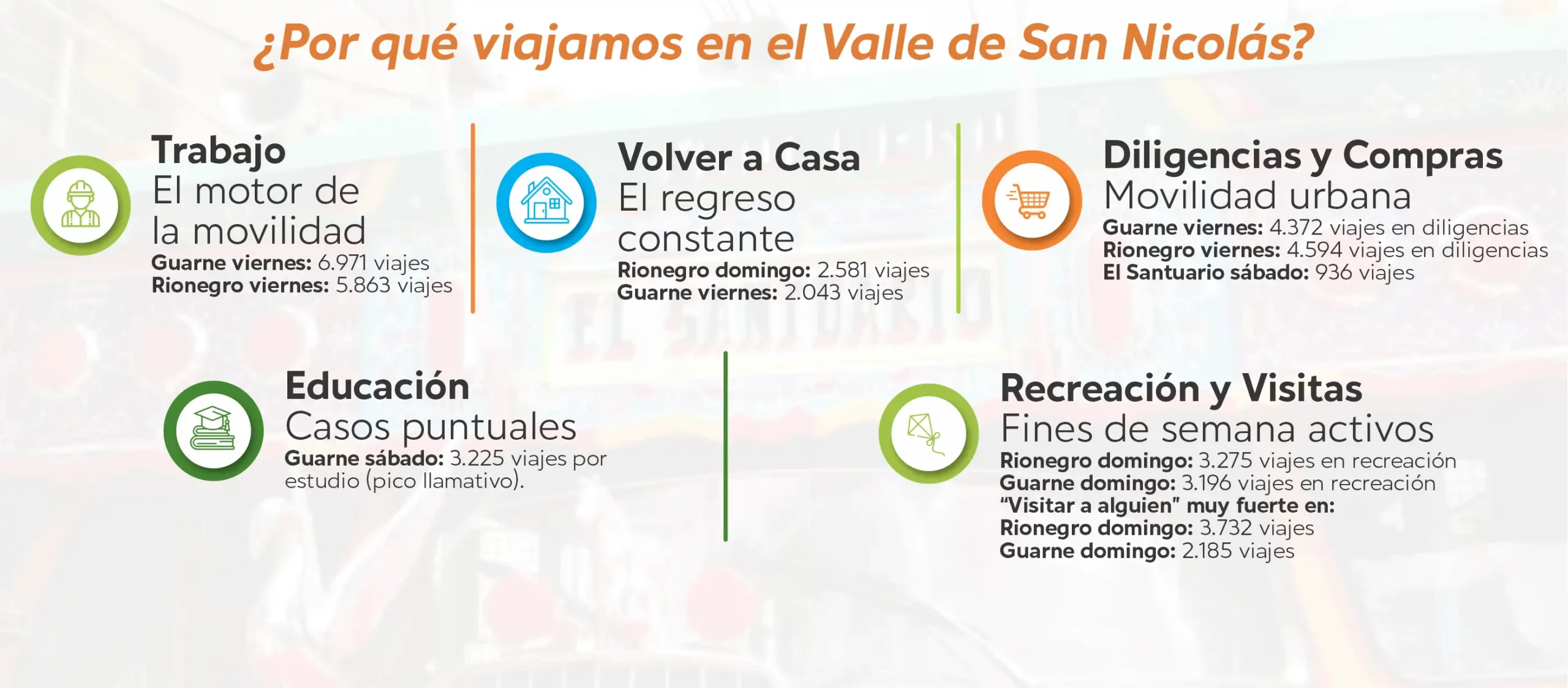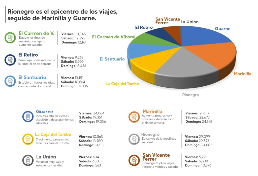 A nivel departamental, el total de viajes con destino a la zona valles de san Nicolás es de 154.412 viajes al día; Rionegro es donde llegan más viajes 44,84% de total de los viajes, es decir, 69.241, seguido de los municipios de la Ceja del Tambo y Guarne con 11,43% y 10,69% respectivamente. Esta dinámica reclama un sistema integrado de transporte público y red vial que reduzca tiempos y costos, con planeación conjunta de corredores.