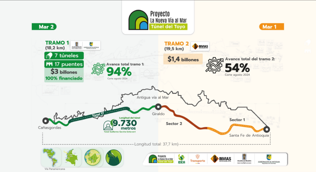El proyecto total de la nueva Vía al Mar – Túnel del Toyo tiene una longitud de 37.7 kilómetros y está dividido en dos tramos. El tramo 1, cuya ejecución está a cargo del Departamento de Antioquia y el Distrito de Medellín, abarca 18.2 kilómetros e incluye el Túnel del Toyo, el más largo de América, con 9.7 kilómetros. El avance de este tramo es del 94%, y se requiere una inversión total de 3 billones de pesos, de los cuales 2.23 billones corresponden a la Gobernación y 770 mil millones al Distrito.