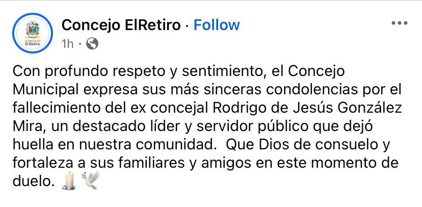 Los mensajes de pesar llegaron desde el Concejo de El Retiro, recinto en el que Toza ocupó una curul en dos oportunidades: “Con profundo respeto y sentimiento, el Concejo Municipal expresa sus más sinceras condolencias por el fallecimiento del ex concejal Rodrigo de Jesús González Mira, un destacado líder y servidor público que dejó huella en nuestra comunidad. Que Dios de consuelo y fortaleza a sus familiares y amigos en este momento de duelo”.