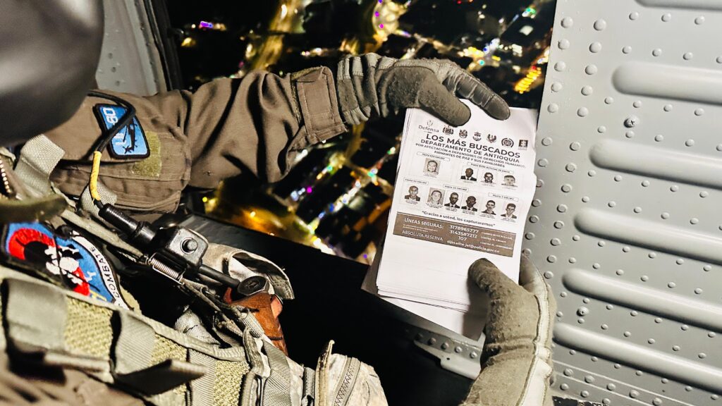 La Fuerza Aeroespacial Colombiana (FAC) desplegó una operación informativa en varias zonas del oriente de Antioquia, con el objetivo de difundir la identidad de los criminales más buscados en el departamento. Un helicóptero UH-60 del Comando Aéreo de Combate No. 5 (CACOM 5) sobrevoló diferentes municipios y distribuyó volantes con información clave sobre los líderes de organizaciones criminales que afectan la seguridad y la tranquilidad de las comunidades.