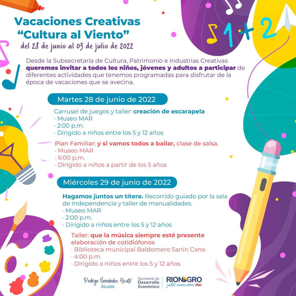 La Alcaldía de Rionegro, acompaña a los niños y jóvenes de la ciudad en el receso escolar de mitad de año, para esto, la Secretaría de Desarrollo Económico, a través de la Subsecretaría de Cultura, Patrimonio e Industrias Creativas, ha diseñado un cronograma de actividades a realizar durante junio y julio.