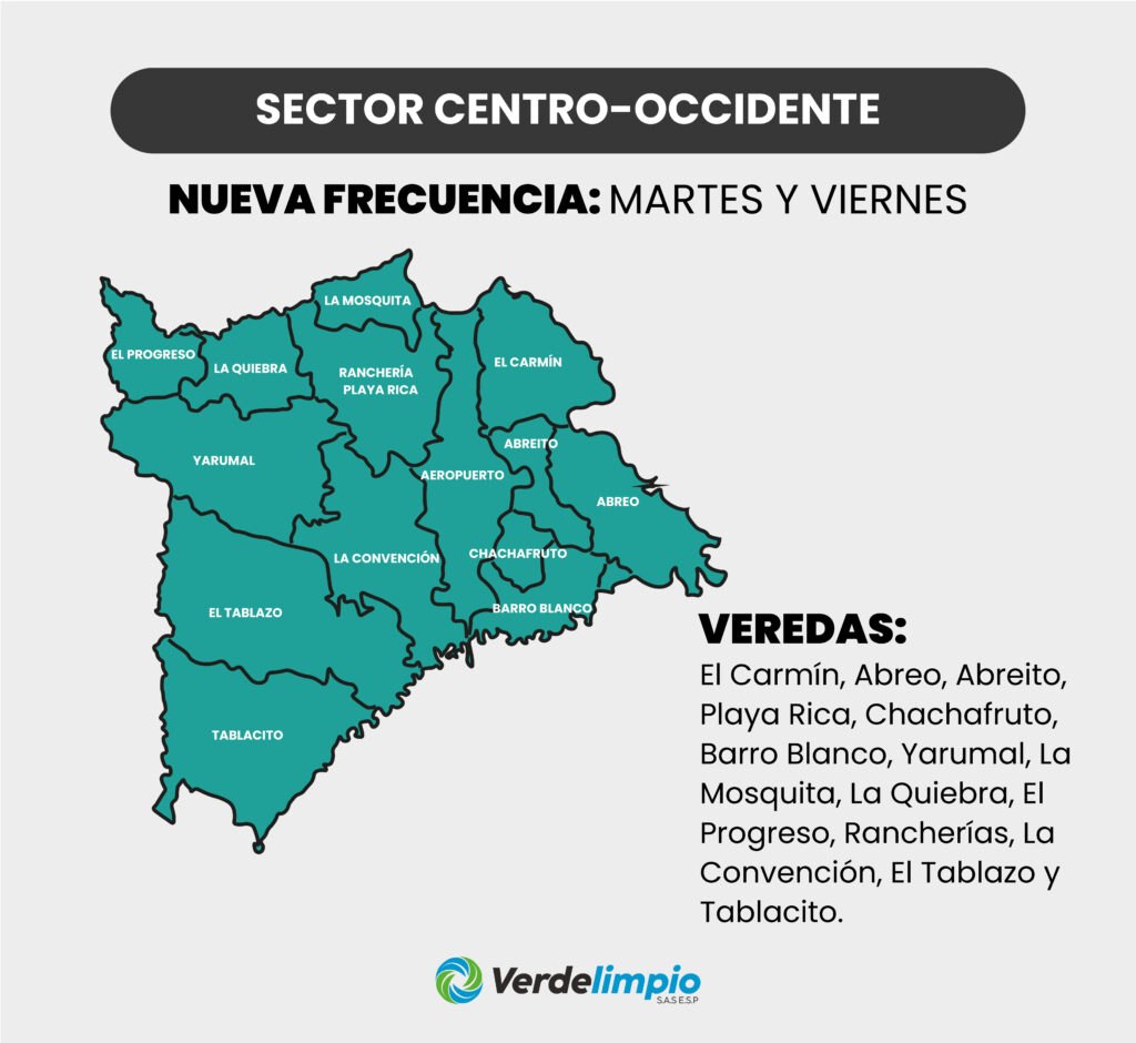 A partir del lunes 28 de abril, Verdelimpio implementará nuevas frecuencias de recolección de residuos no aprovechables en las veredas rurales de Rionegro, con el fin de mejorar la eficiencia del servicio y asegurar una cobertura más oportuna. Esta medida es parte de un plan operativo que busca estandarizar los horarios de recolección, reducir la huella de carbono y fomentar el aprovechamiento de residuos.