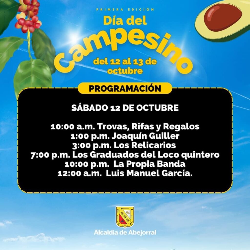 La administración municipal de Abejorral ha dado a conocer la programación oficial del Día del Campesino, que se llevará a cabo los días 12 y 13 de octubre. Durante estas jornadas, se realizarán diversas actividades para resaltar la labor de los campesinos en el Municipio.