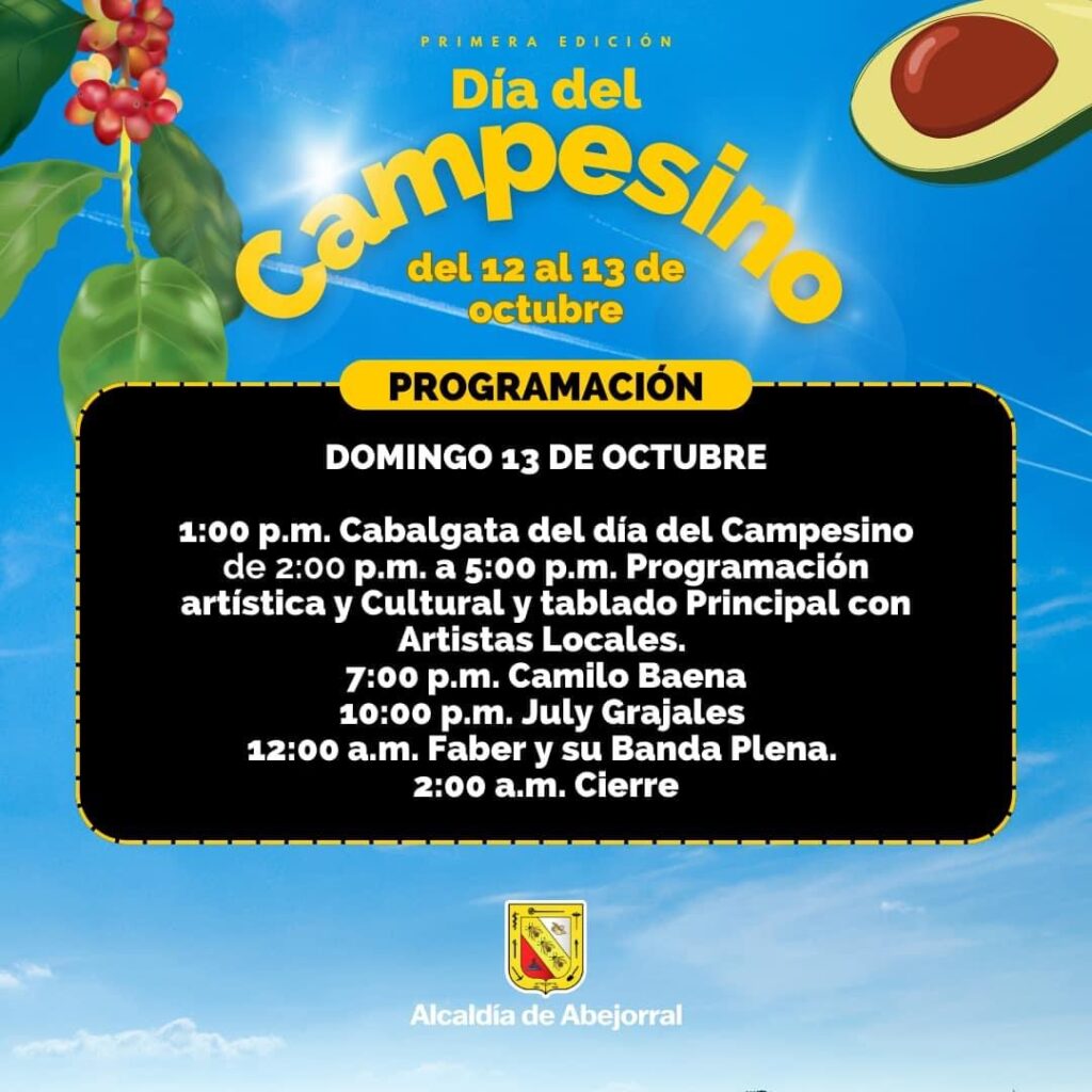 El domingo 13 de octubre, la cabalgata del Día del Campesino arrancará a la 1:00 p.m. Posteriormente, entre las 2:00 p.m. y las 5:00 p.m., se llevará a cabo la programación artística y cultural con la participación de artistas locales en el tablado principal. En la noche, se presentarán Camilo Baena a las 7:00 p.m., July Grajales a las 10:00 p.m., y Faber y su Banda Plena a la medianoche, finalizando las actividades a las 2:00 a.m.