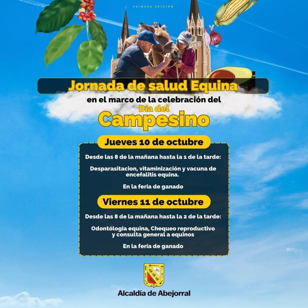 Adicionalmente, como parte de la celebración, se realizarán jornadas de salud equina los días jueves 10 de octubre, de 8:00 a.m. a 1:00 p.m., y viernes 11 de octubre, de 8:00 a.m. a 2:00 p.m., en la Feria de Ganado. Estas incluirán desparasitación, vitaminización, vacunación contra la encefalitis equina, odontología equina, chequeo reproductivo y consultas generales para los equinos.